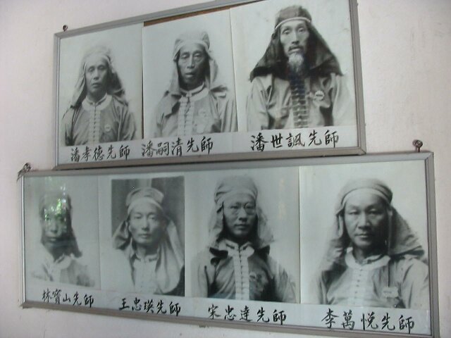 | The main alter in the Wu Shu Guan. The two photos are of Pan Shiow De ( Pan Cheng Miouw's father ) and Pan Ze Hong ( Pan Cheng Miouw's uncle ). | The 7 man team who went to Malaysia and Singapore in 1929. From left to right top to bottom they are: Pan Shiow De, Pan Sr Ching, Pan Sr Huang, Lin Bau San, Wang jong Yin, Sung Zhon Da, Li Wan Yue. | ||