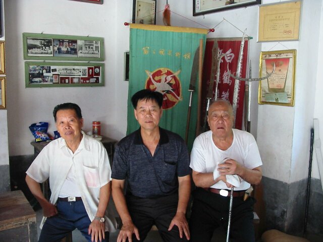 | Some of the weapons used in Bai He Chuan. Most of the weapons practiced in the system are large weapons. In addition they practice the Butterfly Knives, Tonfla and Tsai. | Left to right, Zo He Han , Pan Cheng Miouw and Zhang Hen Sang. They are all teachers and students of Pan Shiouw De. Pan Shiouw De gave his walking stick to the gentleman on the left. | ||