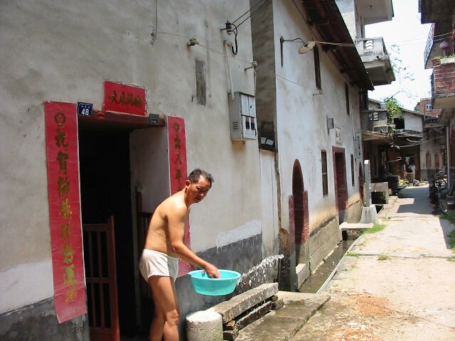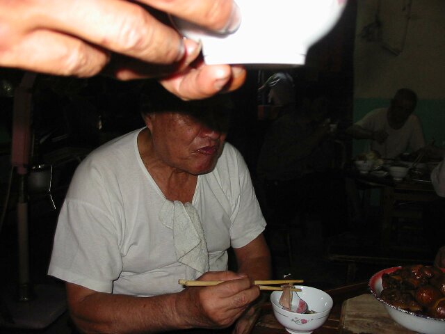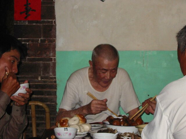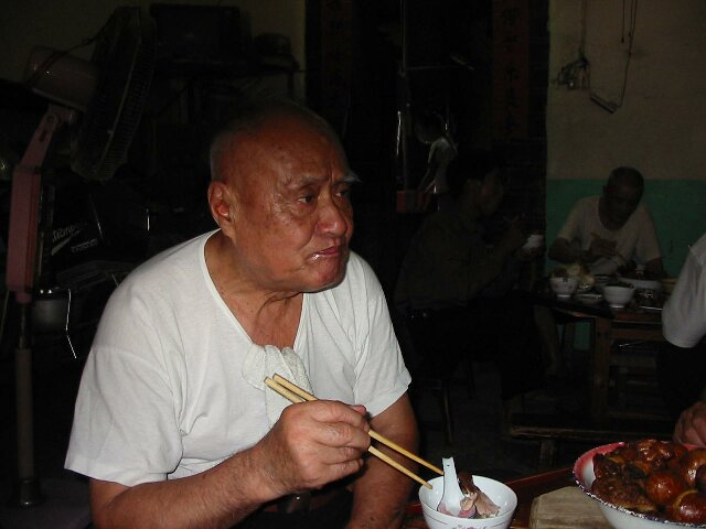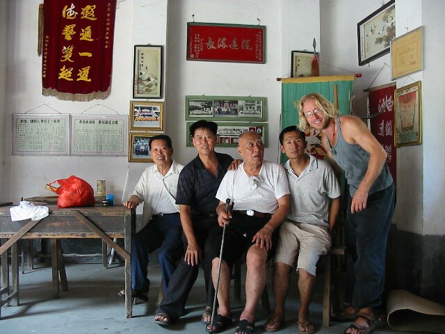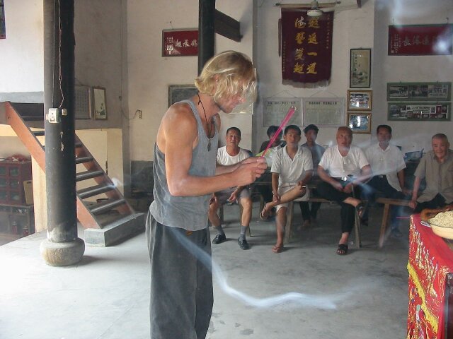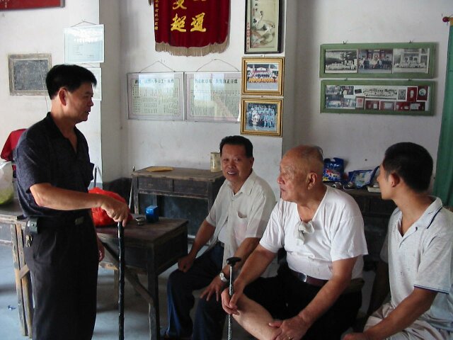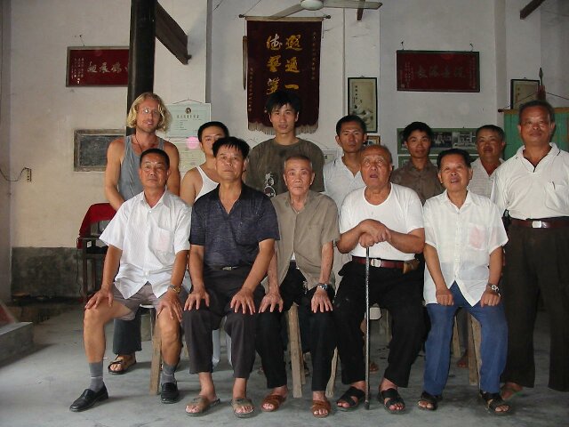 | Martin Watts honouring the ancestors. | The gentleman on the right is Yuan Gong Kan. At 88 he is the oldest current practitioner and teacher in Yong Chun. In Chuen Zo there is also an 88 year old practitioner called Lin Tien Luei who was also a student of Pan Xioe De. The young man second from left at the back is Yuan Ze Ying. He is Yuan Gong Kan's grandson. You can see him in the video section. The gentleman on the left is Juan Suen Zhuang is a student of Hung Shr Fu ( deceased ). | ||